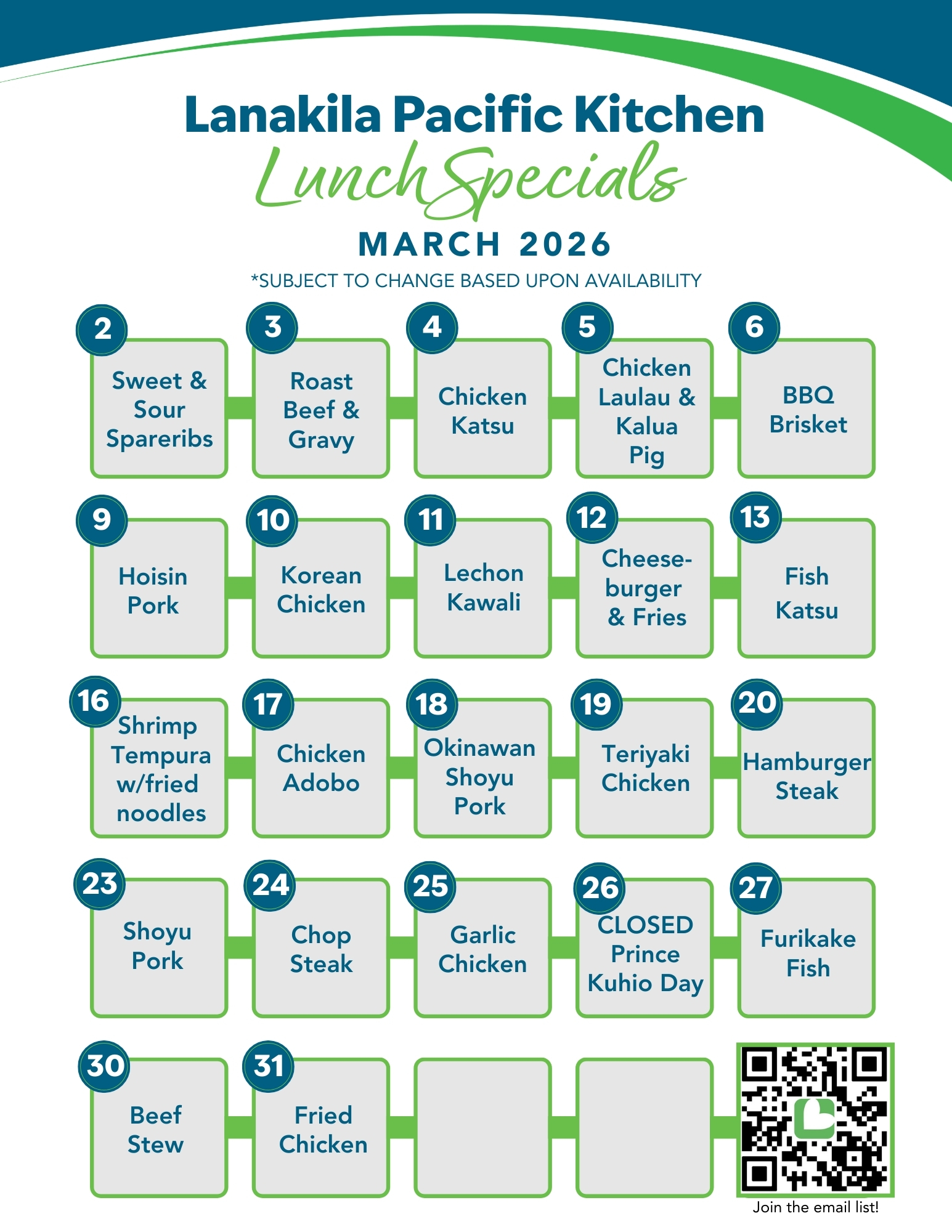 We offer a variety of baked goods such as scones, lilikoi bars, and cookies. Our cafeteria serves breakfast/lunch plates that reflect local flavors and favorites. From Hawaiian plates to garlic chicken, loco moco to BBQ brisket, we got it all!
